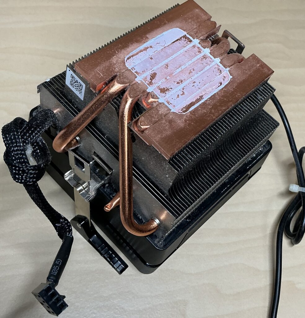 ようやくファンを取り外せたのですが、懸念していた“スッポン状態”(ファンにCPUがくっついて抜ける現象)になっていました。購入してから3年以上経っていたため、グリスがカチカチに固まり、接着剤のようになっていたようです。とりあえずマイナスドライバーをCPUとファンの隙間に差し込んでみたところ、比較的弱い力でCPUを外すことができました。ただ、ファン取り外し時のストレスでいくつかのピンが曲がってしまっていたため、電子工作で使っていた先の尖ったピンセットでピンを真っ直ぐに修正しました。ついでに、ピンや基板のソケット部分に付着していたゴミをエアダスターで吹き飛ばしておきました。下の写真は、CPUを取り外した後の元々ついていたCPUクーラーです。